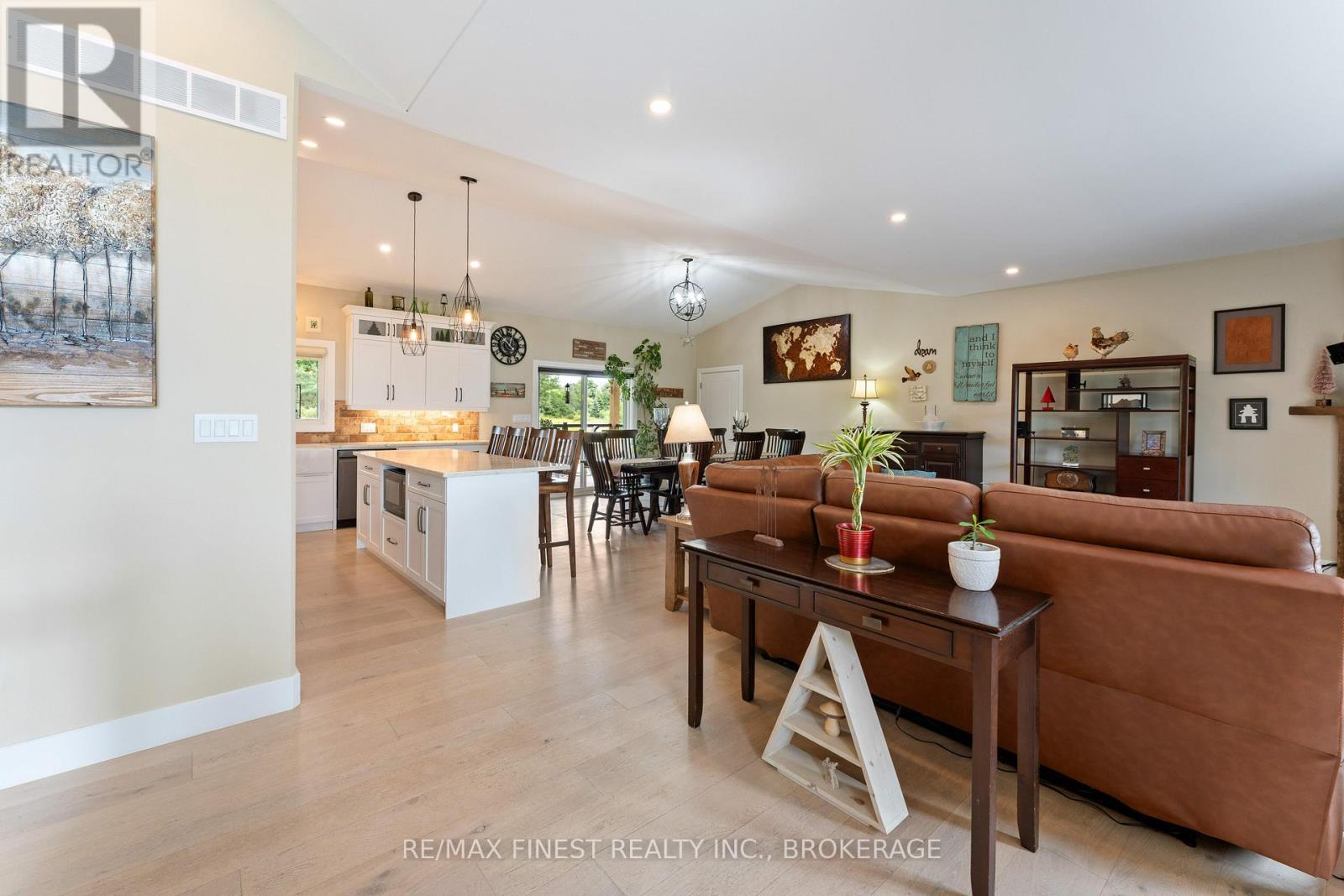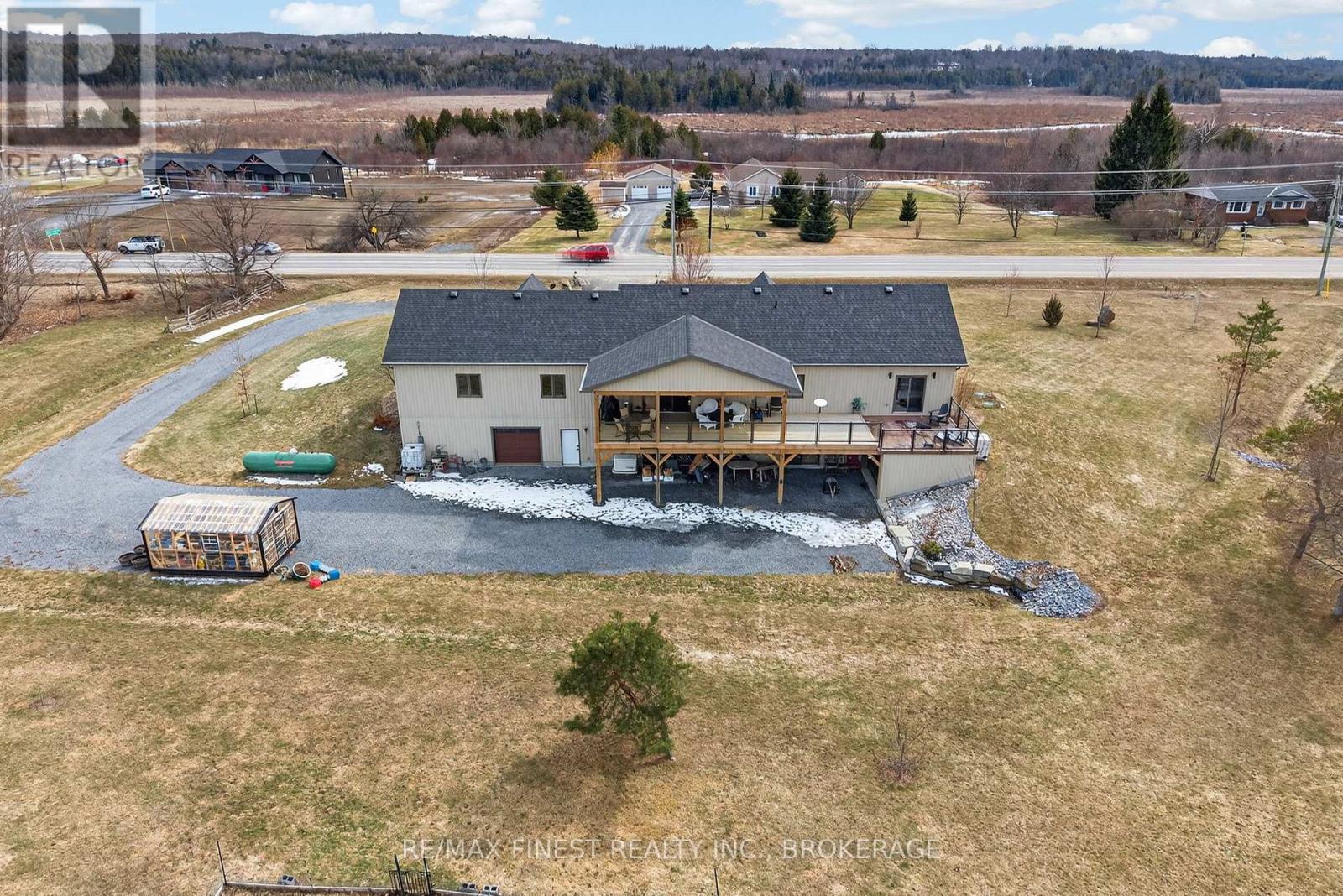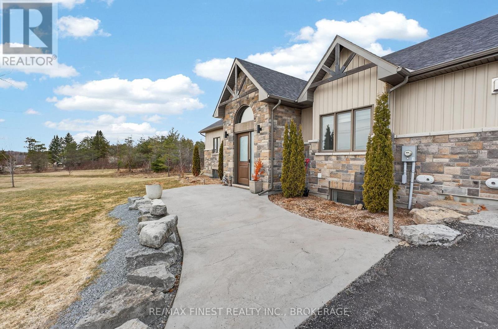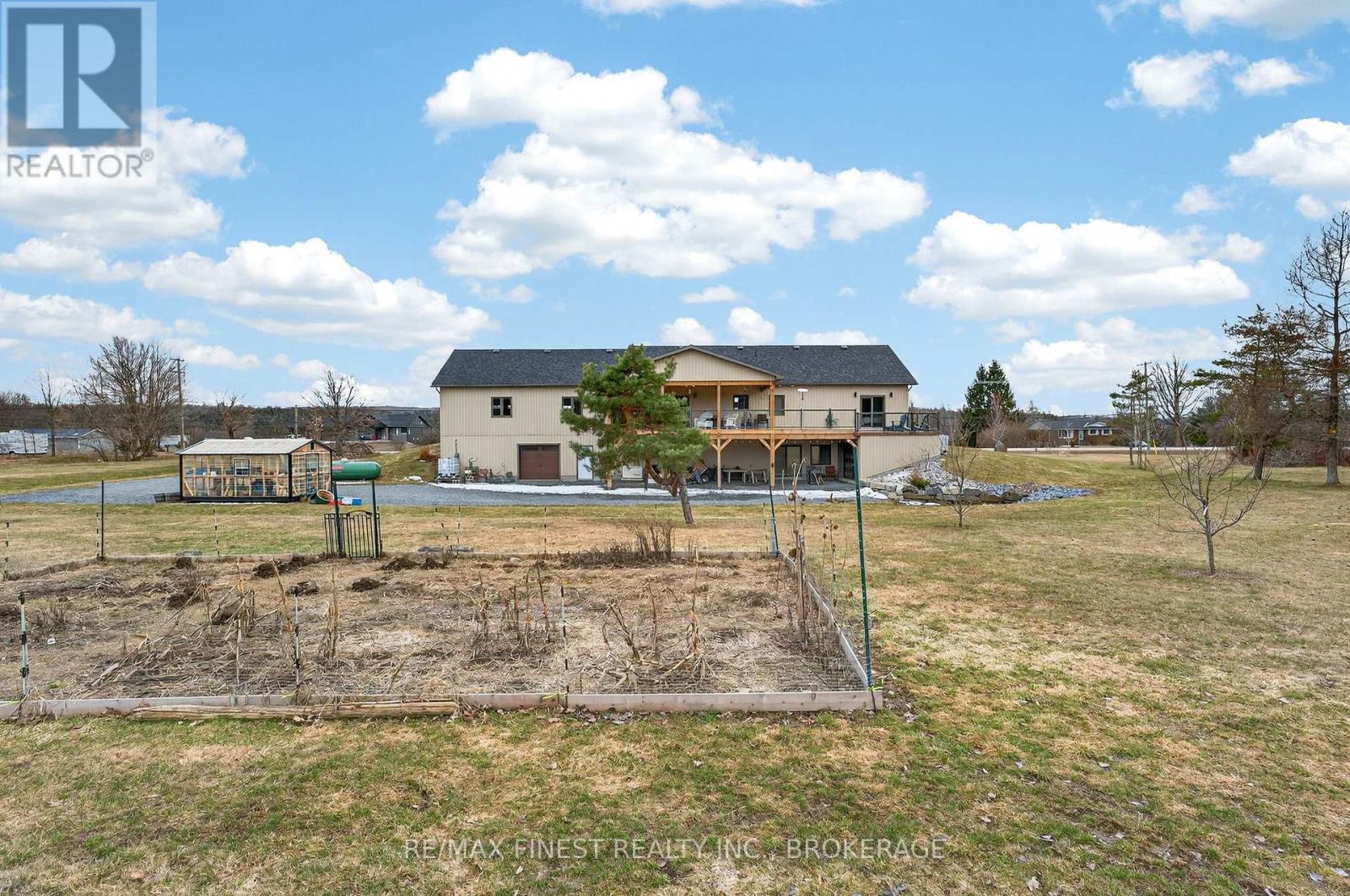 Thoughtfully designed, beautifully maintained, and upgraded throughout, this 5-year-oldbungalow offers a lifestyle as remarkable as its features. From the moment you arrive, the property's presence captivates with 3 acres of professionally landscaped grounds with trees, vibrant gardens, natural stone accents, and a 3-wide paved driveway that gracefully wraps around to the rear garage and patio. Inside, light-filled spaces blend comfort with sophistication. The open-concept main level is anchored by a stunning stone fireplace with a propane insert, creating a warm focal point in the living area. The kitchen showcases stone countertops, stainless steel appliances, and picturesque views of the private backyard. The primary suite is a retreat of its own, featuring a 4-piece ensuite with built-in vanity, walk-in closet, additional closet, and patio doors leading to a stamped-concrete balcony and an expansive 15x64' deck. A 30' section of this outdoor haven is fully covered, featuring a ceiling fan, pot lights, electrical outlets, and BBQ hookup - the perfect setting for morning coffee or evening gatherings. Two additional bedrooms and a 4-piece bath complete the main level. The lower level expands the possibilities with a large rec room, spacious bedroom, a separate den/home office, a 3piece bathroom, generous storage, a walk-out to the yard, and direct access to the lower garage. This two-level heated garage with six bays finished in epoxy provides endless options for a home workshop, car collection, or recreational toys. A dedicated backyard bar room, with a wet bar, epoxy flooring and a roll-up glass garage door opens to the patio below the deck, offering a distinctive venue for year-round entertaining. A 20KW Generac generator ensures peace of mind in all seasons. Positioned between Harrowsmith and Sydenham, this home combines the tranquility of rural living with access to local amenities and only 20 minutes to Kingston. (id:52904)