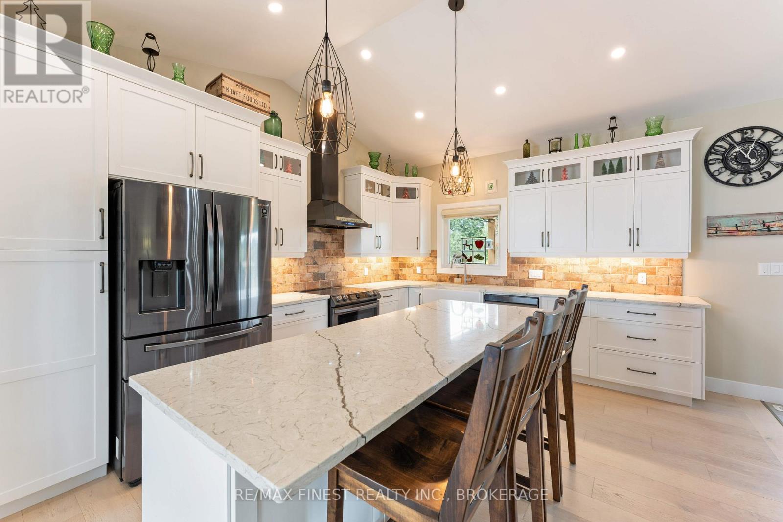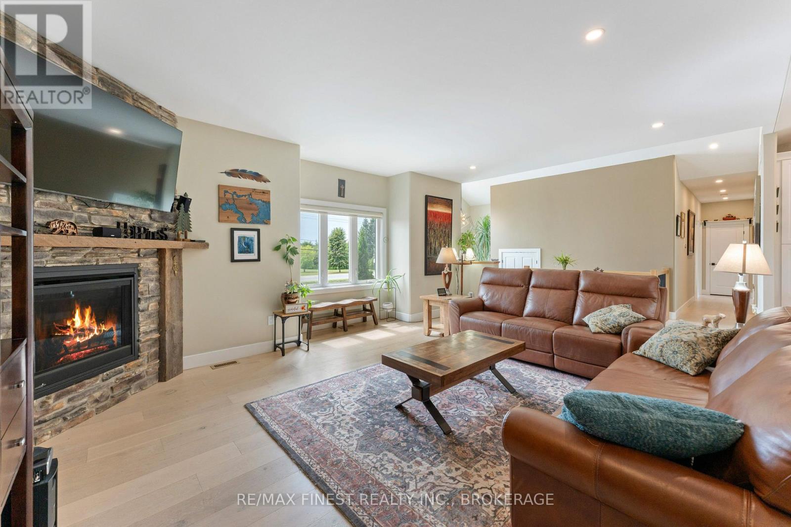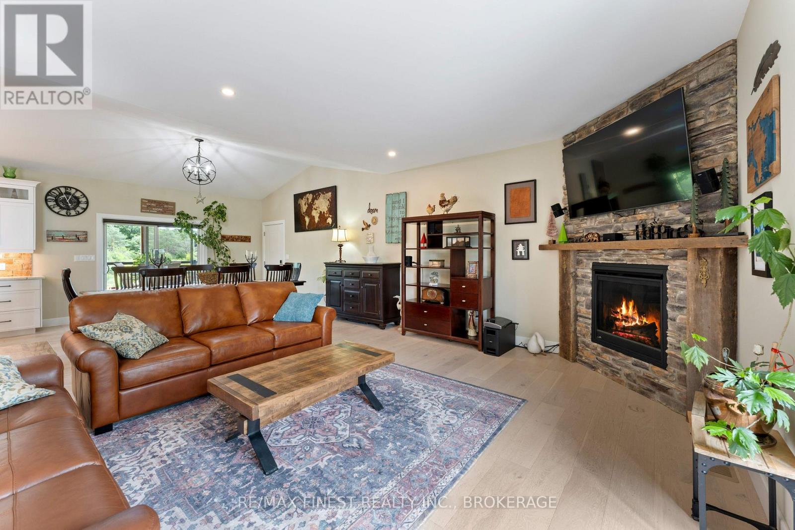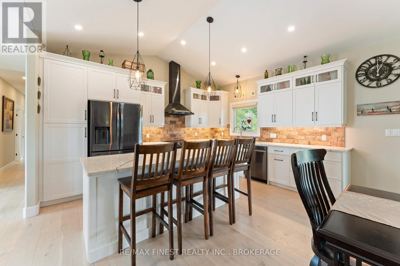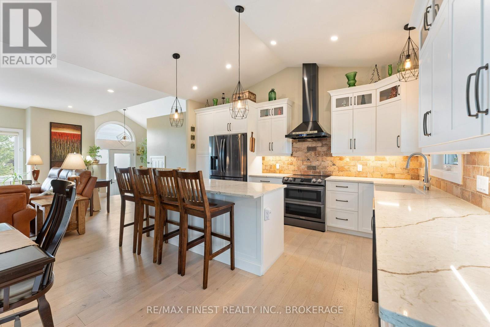 Thoughtfully designed, beautifully maintained, and upgraded throughout, this 5-year-oldbungalow offers a lifestyle as remarkable as its features. From the moment you arrive, the property's presence captivates with 3 acres of professionally landscaped grounds with trees, vibrant gardens, natural stone accents, and a 3-wide paved driveway that gracefully wraps around to the rear garage and patio. Inside, light-filled spaces blend comfort with sophistication. The open-concept main level is anchored by a stunning stone fireplace with a propane insert, creating a warm focal point in the living area. The kitchen showcases stone countertops, stainless steel appliances, and picturesque views of the private backyard. The primary suite is a retreat of its own, featuring a 4-piece ensuite with built-in vanity, walk-in closet, additional closet, and patio doors leading to a stamped-concrete balcony and an expansive 15x64' deck. A 30' section of this outdoor haven is fully covered, featuring a ceiling fan, pot lights, electrical outlets, and BBQ hookup - the perfect setting for morning coffee or evening gatherings. Two additional bedrooms and a 4-piece bath complete the main level. The lower level expands the possibilities with a large rec room, spacious bedroom, a separate den/home office, a 3piece bathroom, generous storage, a walk-out to the yard, and direct access to the lower garage. This two-level heated garage with six bays finished in epoxy provides endless options for a home workshop, car collection, or recreational toys. A dedicated backyard bar room, with a wet bar, epoxy flooring and a roll-up glass garage door opens to the patio below the deck, offering a distinctive venue for year-round entertaining. A 20KW Generac generator ensures peace of mind in all seasons. Positioned between Harrowsmith and Sydenham, this home combines the tranquility of rural living with access to local amenities and only 20 minutes to Kingston. (id:52904)