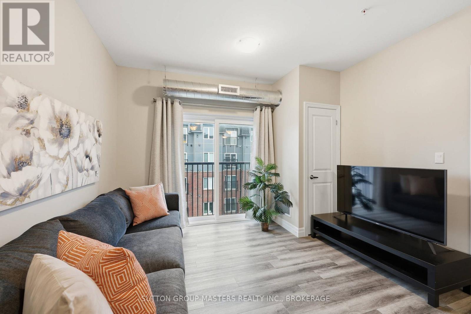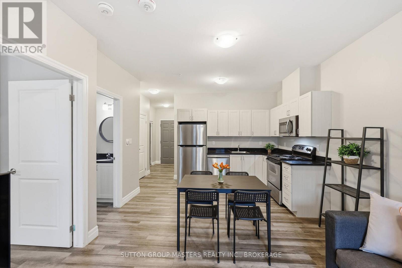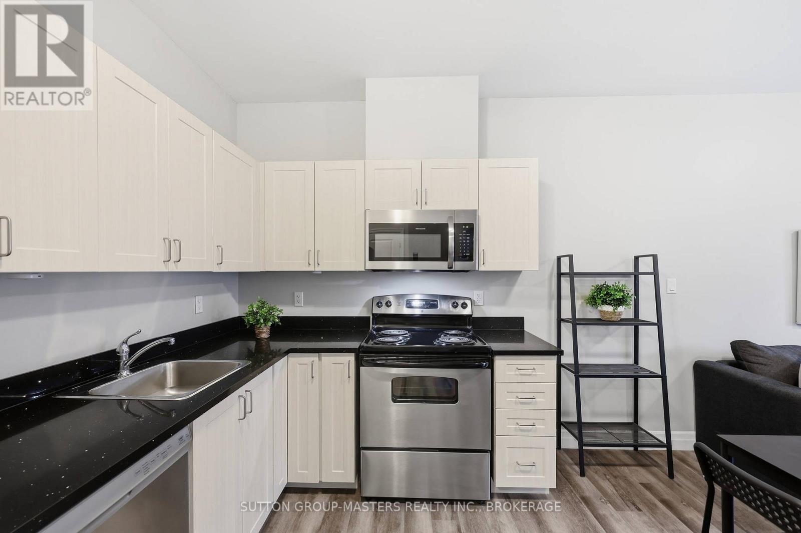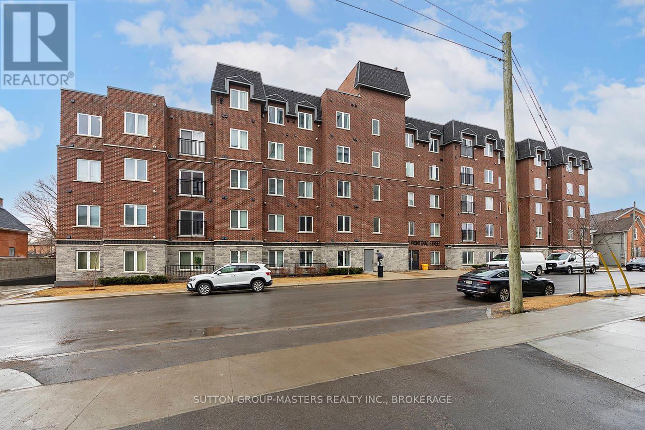 $353.98 MonthlyPrime location in one of Kingston's newer, meticulously managed condominium buildings, just a short walk to Queen's University and all the amenities of the Limestone City's vibrant downtown core. Situated on the desirable 4th floor, this bright and inviting unit offers a fantastic open-concept layout with soaring ceilings, durable laminate flooring, and the convenience of in-suite laundry. Well maintained throughout, the space features neutral décor, stainless steel kitchen appliances, and gleaming quartz countertops in both the kitchen and bathroom. Natural light pours in through the Juliette balcony, offering a pleasant view overlooking the courtyard. This unit also includes exclusive deeded parking in the secure underground garage, conveniently located just steps from the elevator. The building is well equipped with secure front entry, a fitness room, a bookable party room, and an expansive rooftop terrace complete with BBQs - perfect for enjoying time with friends during the warmer months. With easy access to public transit, restaurants, shops, and parks, this is an ideal opportunity for busy professionals or students seeking a low-maintenance lifestyle. All furniture and kitchenware are negotiable, making this a truly move-in-ready option. Come see it for yourself! (id:52904)