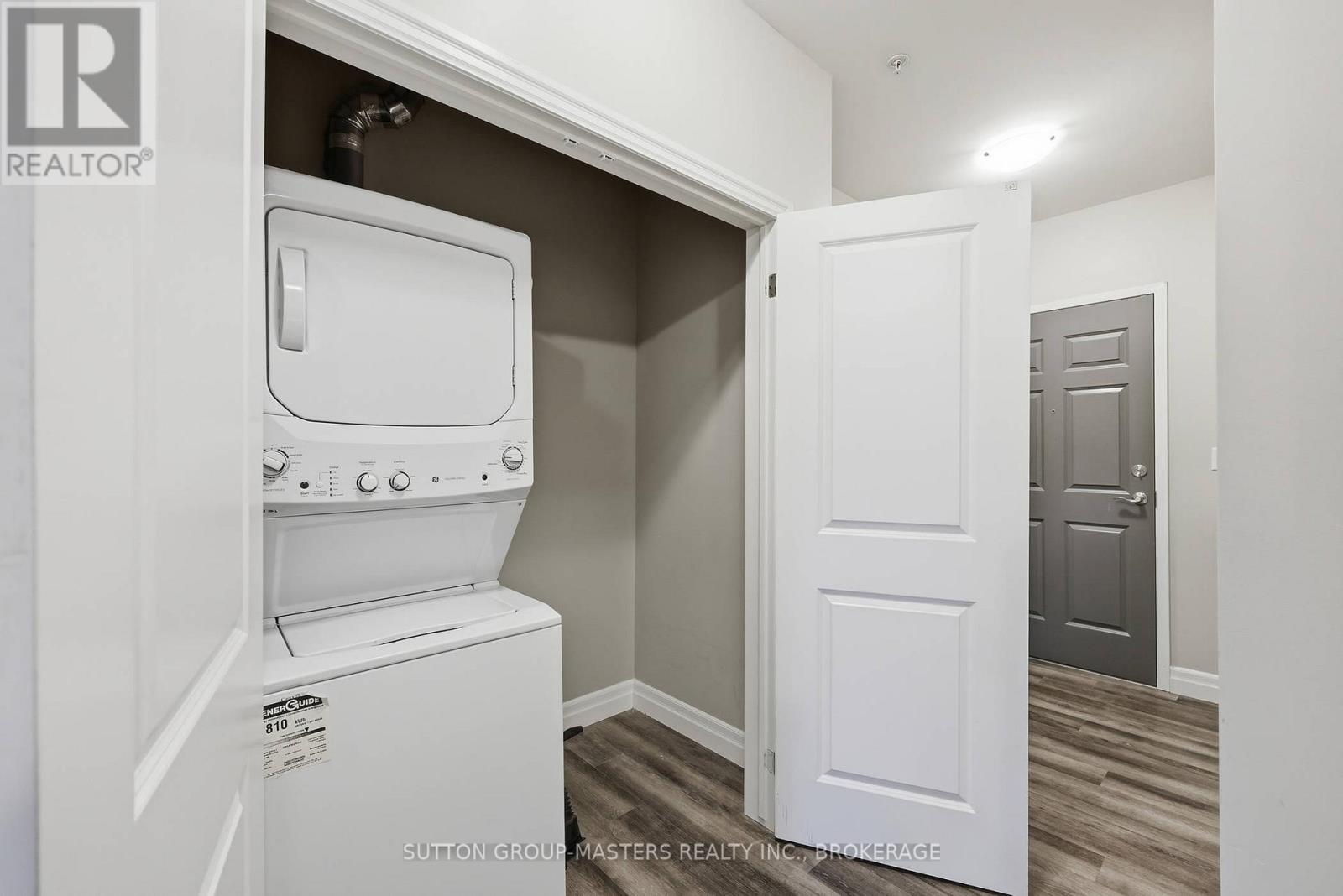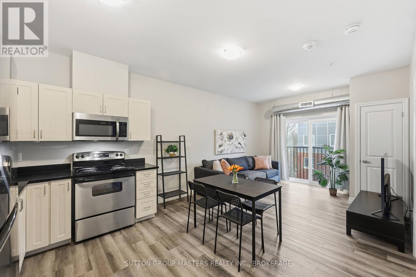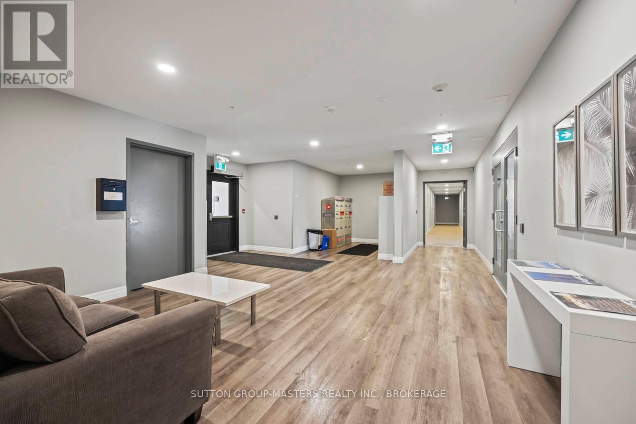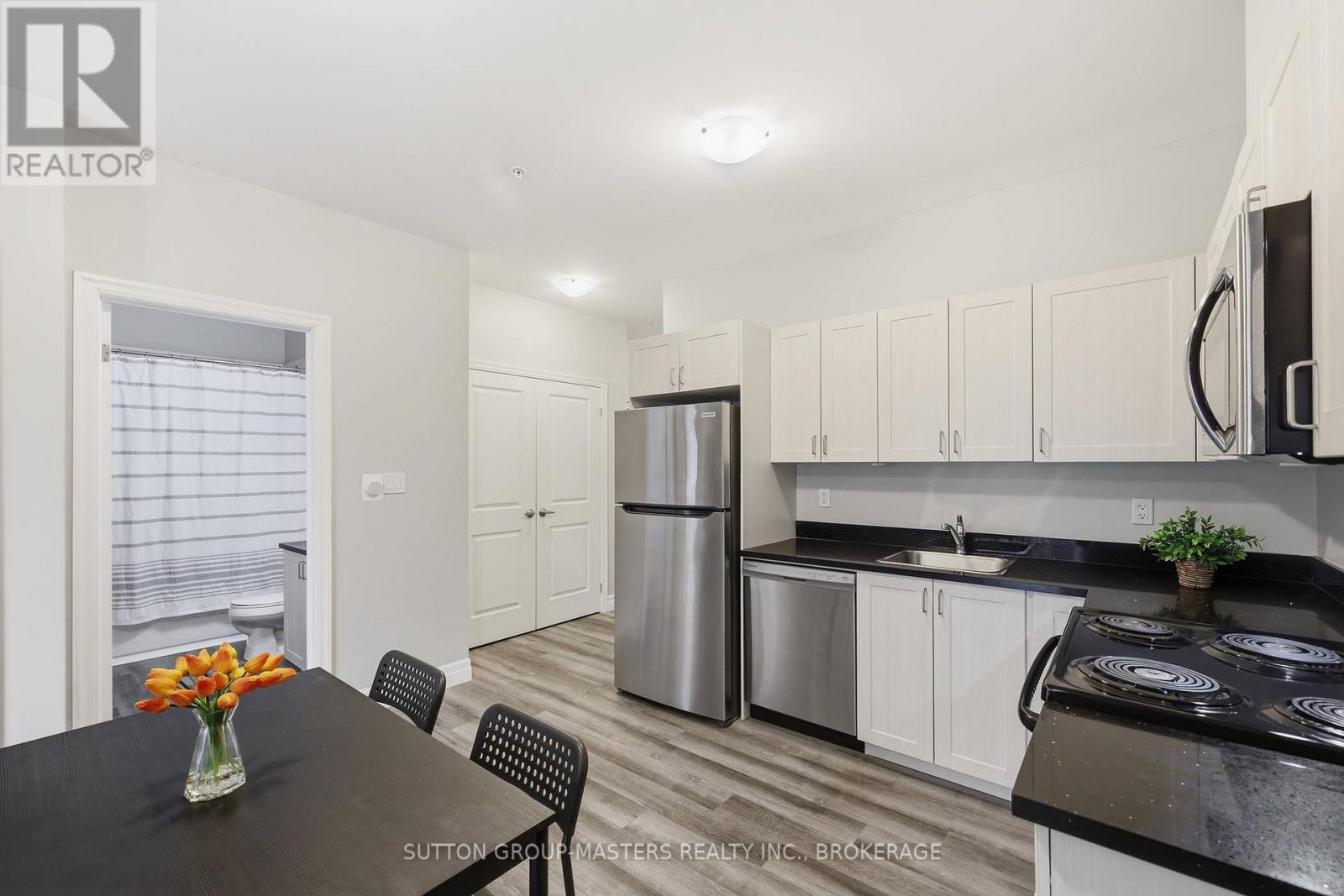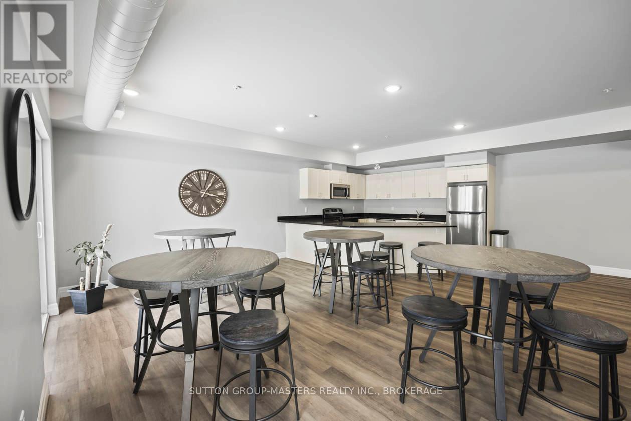 $353.98 MonthlyPrime location in one of Kingston's newer, meticulously managed condominium buildings, just a short walk to Queen's University and all the amenities of the Limestone City's vibrant downtown core. Situated on the desirable 4th floor, this bright and inviting unit offers a fantastic open-concept layout with soaring ceilings, durable laminate flooring, and the convenience of in-suite laundry. Well maintained throughout, the space features neutral décor, stainless steel kitchen appliances, and gleaming quartz countertops in both the kitchen and bathroom. Natural light pours in through the Juliette balcony, offering a pleasant view overlooking the courtyard. This unit also includes exclusive deeded parking in the secure underground garage, conveniently located just steps from the elevator. The building is well equipped with secure front entry, a fitness room, a bookable party room, and an expansive rooftop terrace complete with BBQs - perfect for enjoying time with friends during the warmer months. With easy access to public transit, restaurants, shops, and parks, this is an ideal opportunity for busy professionals or students seeking a low-maintenance lifestyle. All furniture and kitchenware are negotiable, making this a truly move-in-ready option. Come see it for yourself! (id:52904)